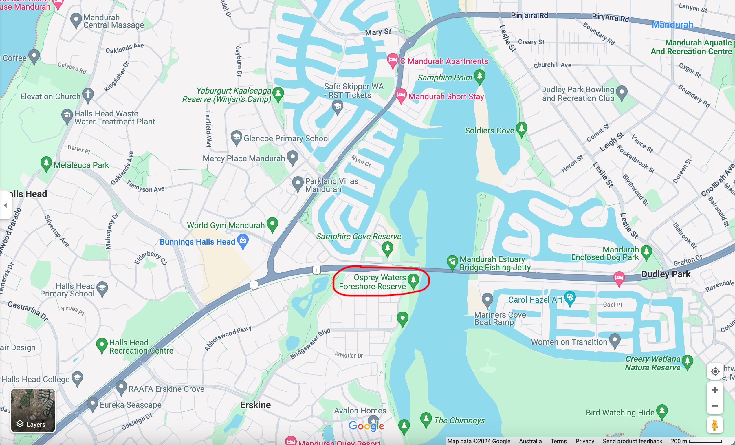 우리의 첫 번째 목적지는 Osprey Waters Foreshore Reserve